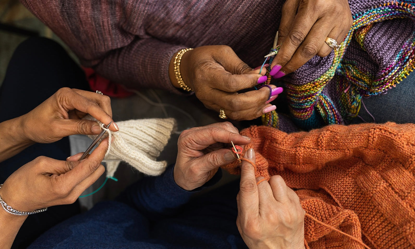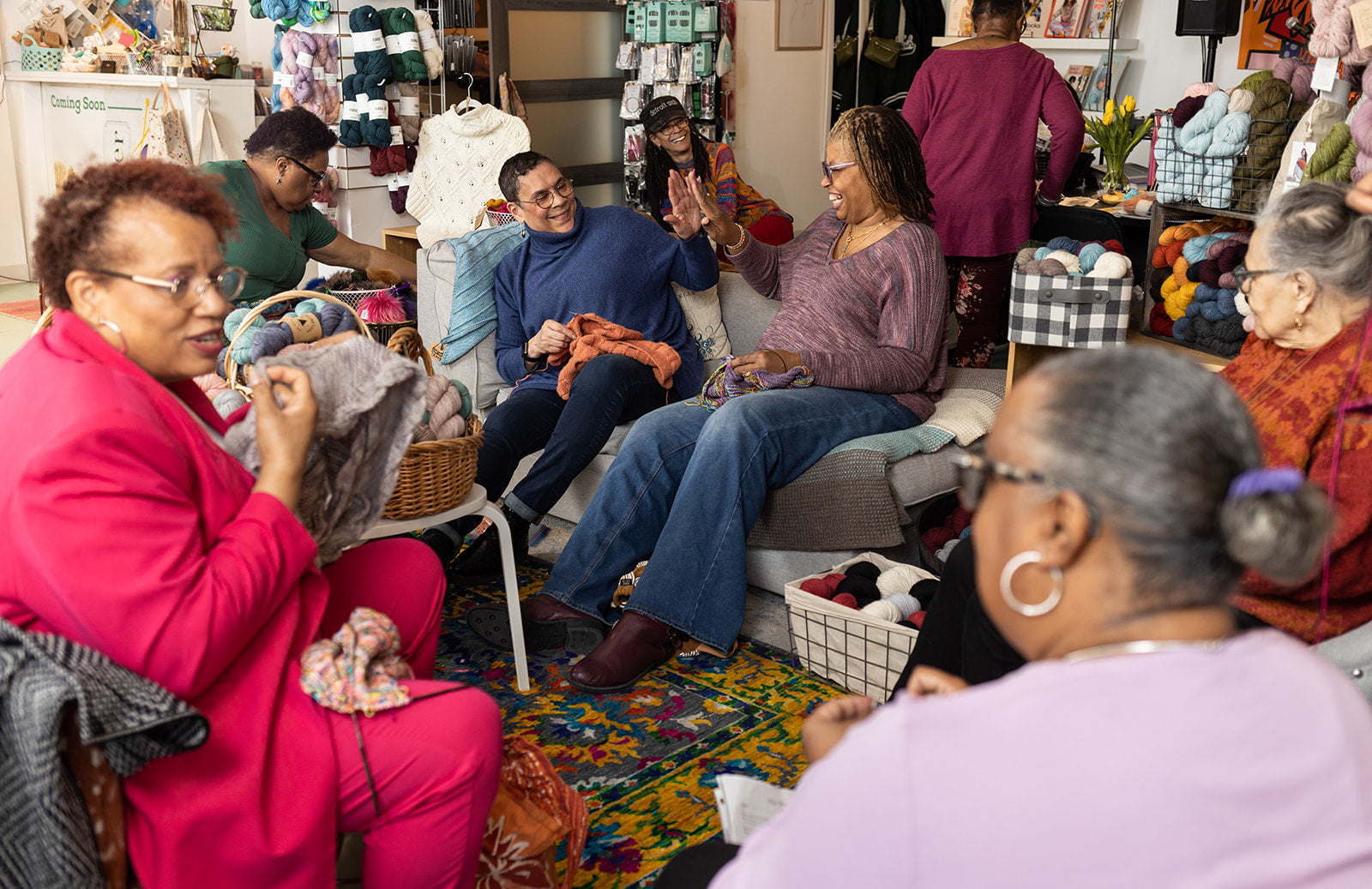 Share over the stitches in our living room. We offer weekly classes, social knitting and more.