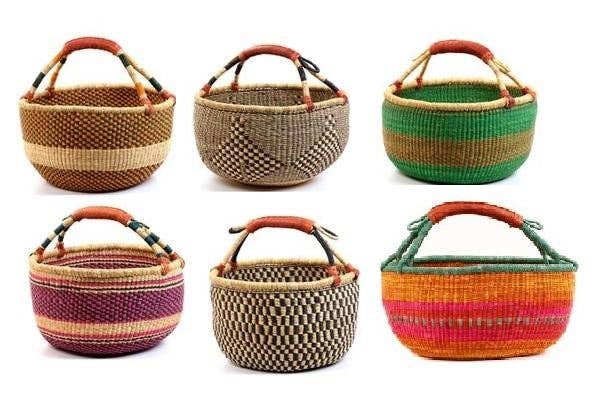 African Market Basket - Ghana Bolga - Ghana Bolga market basket makes a great gift basket! No more surprise.....You will receive the same basket in the picture. These baskets are a traditional shape from the Bolgatanga region of Northern Ghana. Artisans in the Bolgatanga region of Ghana weave these beautiful and durable baskets from thick, tough elephant grass. Bolga basket is a very popular size for children, shoppers, busy mothers and picnic planners worldwide. Bolga baskets stand up to use, practical, sustainable, remain functional, and beautiful for years. Handwoven in Ghana made from local elephant grass. Each basket is one of a kind, in a unique pattern, and he leather wrapped handle adds to the durability. Incredibly sturdy and versatile basket is the perfect home accessory, plant pot, toy basket, Easter egg basket, or market basket. Please note: To reduce postage costs and packaging these baskets are flattened for postage, this does not harm them in any way, and simple instructions