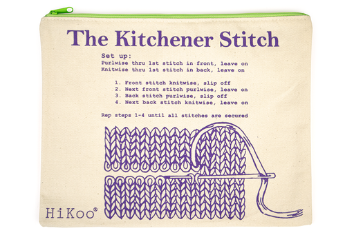 Zip up your WIPs and take them on the go with this lightweight canvas pouch! The 11" wide by 9" tall Kitchener Stitch Pouch has handy Kitchener instructions printed on the front so you never have to look them up again.