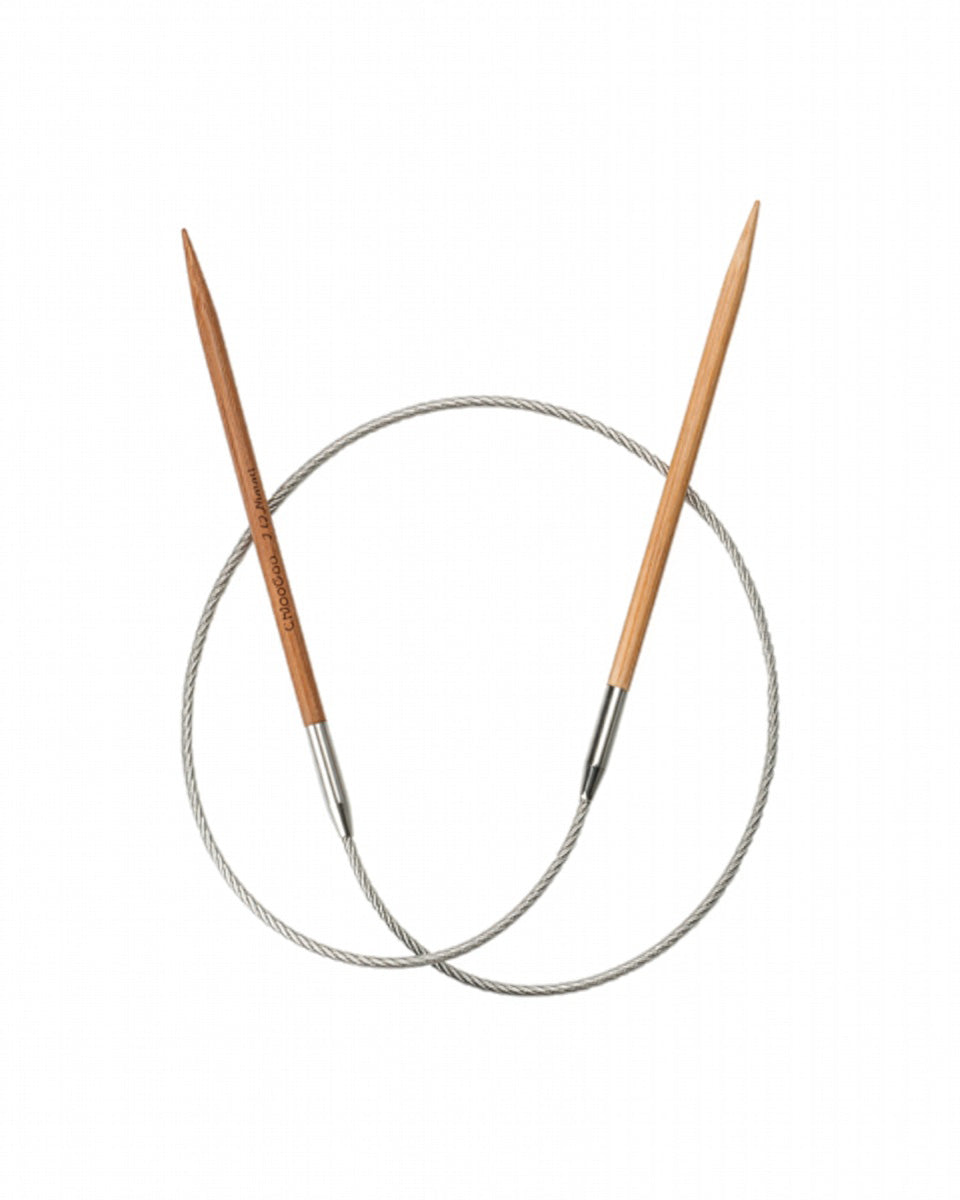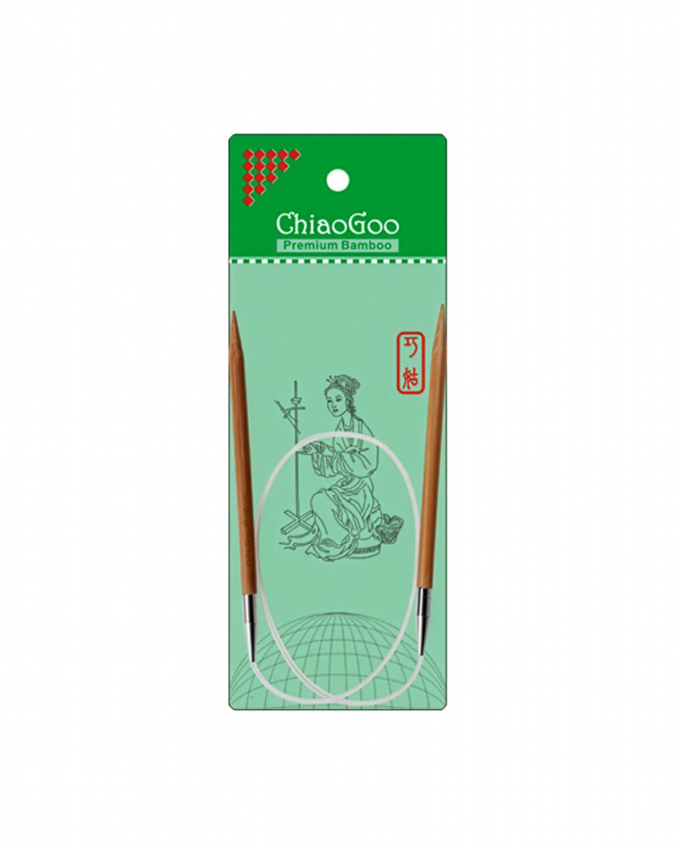 ChiaoGoo 24" (60 cm) patina bamboo circulars have fantastic joins and pliable, clear, nylon cables. They have a nickel-plated, copper join. Sizes 3 (3.25 mm) and larger are crimped to guarantee no separation AND they swivel! Sizes 0 (2 mm) through 2.5 (3 mm) have the same memory-free cable as our RED circulars and TWIST cables! Needle size is permanently laser-etched on each circular.
