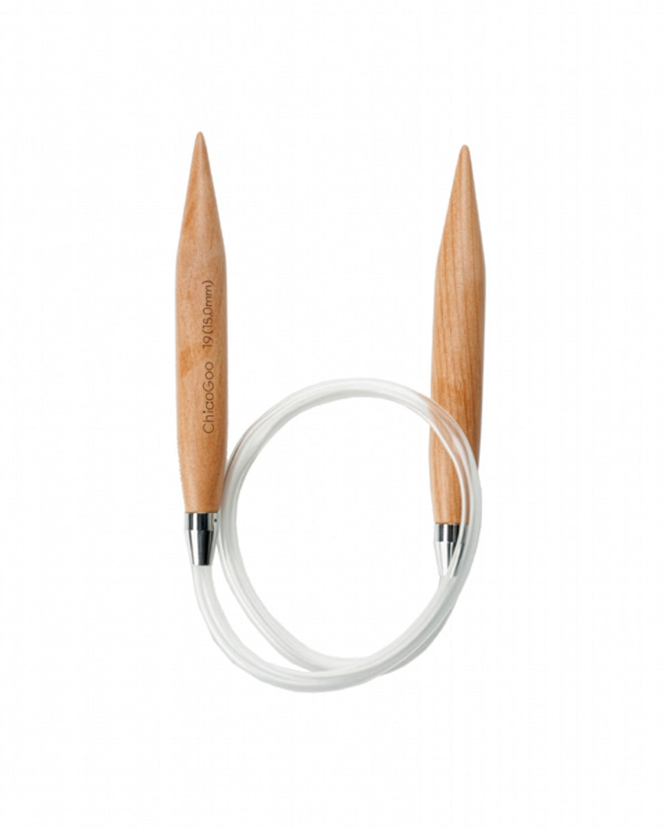 ChiaoGoo 24″ (60 cm) size 17 (12.75 mm) and larger circulars are made of a lightweight wood joined by a clear, hollow, plastic tube. Needle size is permanently laser-etched on each circular. Each tip is crimped for a secure connection.