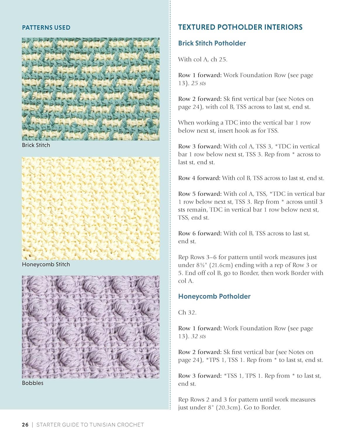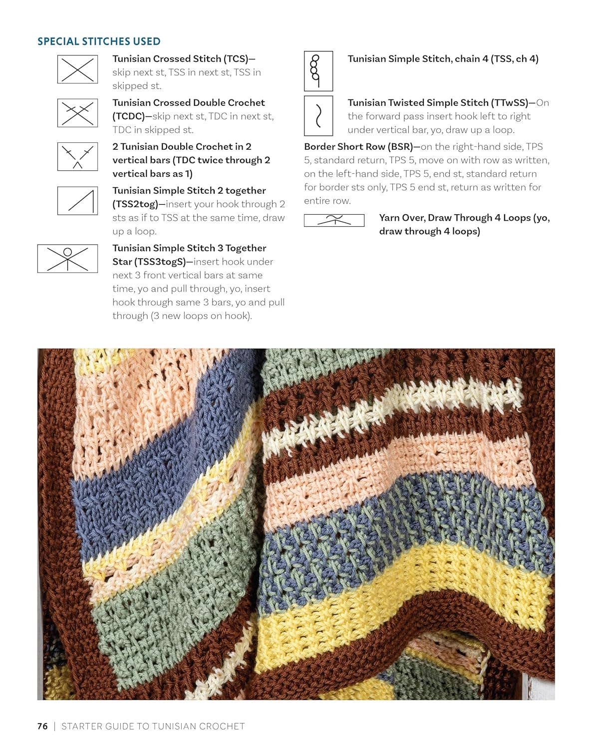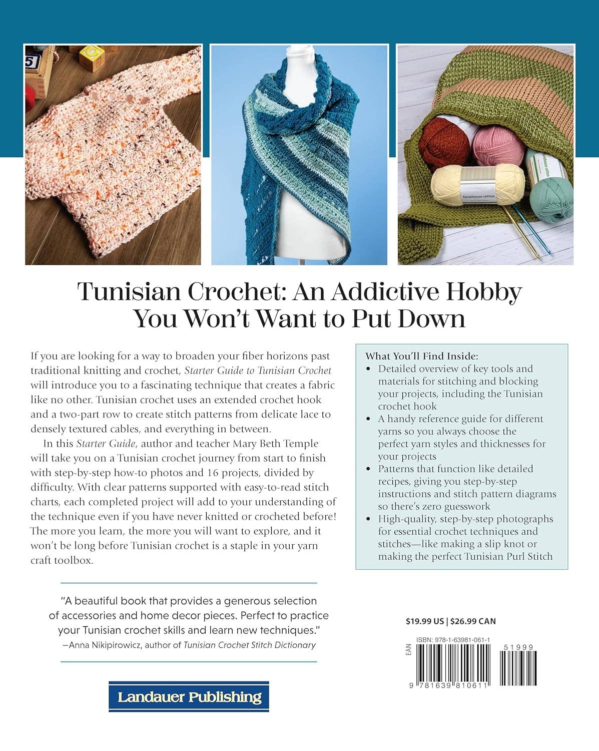 Tunisian crochet, also called Afghan crochet, is a blend between knitting and crochet offering the best aspects of both techniques. It produces a fabric similar to a knit but worked on a hook. It's sturdy, durable, and flexible. Following the success of her first book, Tunisian Crochet Stitch Dictionary, author Mary Beth Temple has written Starter Guide to Tunisian Crochet which contains 15 must-make projects for both beginner and experienced needleworkers. The projects range from the ease of a simple potholder to a more challenging poncho with a blanket project which also serves as a stitch sample project for crochet enthusiasts to work a variety of Tunisian stitches in one beautiful project. Tunisian crochet is a lot quicker, combining the best of knitting and crochet, and it's become one of the most popular approaches for today's crocheters.