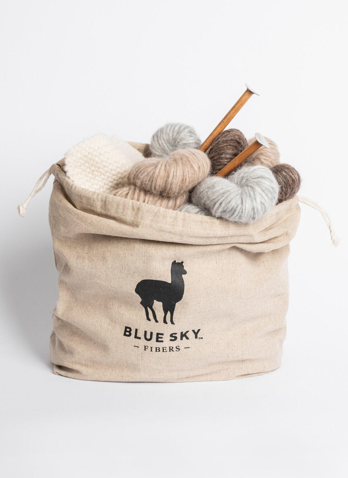 Blue Sky-branded drawstring project bags are perfect for small, on-the-go or big, multi-hank projects. Made of heavy, unbleached cotton canvas.